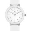| минималистичному белому циферблату с хорошо читаемыми рисками и стрелками, оригинальным креплениям ремешка к корпусу. Сам ремешок сделан из гладкой кожи белого цвета и комфортно облегает запястье. Корпус из гипоаллергенной нержавеющей стали имеет диаметр 34 мм | он украсит любое, даже самое изящное запястье. В модели установлено ударопрочное минеральное стекло Crystex. Повышенная водостойкость равна 10 атмосфер. Эти элегантные и универсальные часы станут стильным дополнением любого образа | от повседневного до вечернего. |