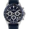 | минутный и секундный накопители, 24-х часовой индикатор и окошко даты. Ударопрочное минеральное стекло Crystex надежно защищает циферблат от внешних воздействий. Повышенная водостойкость в 20 атмосфер обеспечивается завинчивающимися заводной головкой и крышкой. Плотный синий ремешок сделан из натуральной кожи с прошивкой. |