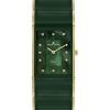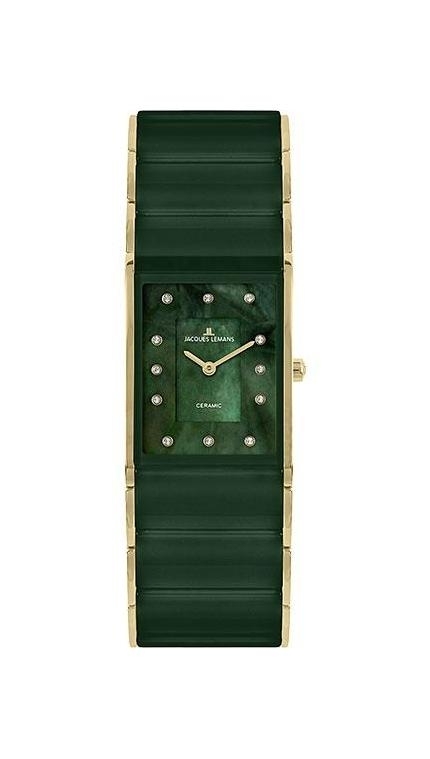 С инкрустацией Элегантная женская модель с кварцевым механизмом. Тонкий корпус из нержавеющей стали диаметром 24 х 28 мм дополнен PVD-покрытием из желтого золота. Объемный циферблат зеленого цвета выполнен из натурального перламутра. В роли маркеров выступают кристаллы Swarovski. В часах установлено минеральное стекло с сапфировым напылением. Водонепроницаемость составляет 5 атмосфер. Звенья браслета сделаны из высокотехнологичной керамики – современного материала, обладающего естественным блеском и способностью противостоять появлению микроцарапин. Застежка — бабочка обеспечивает надежность.