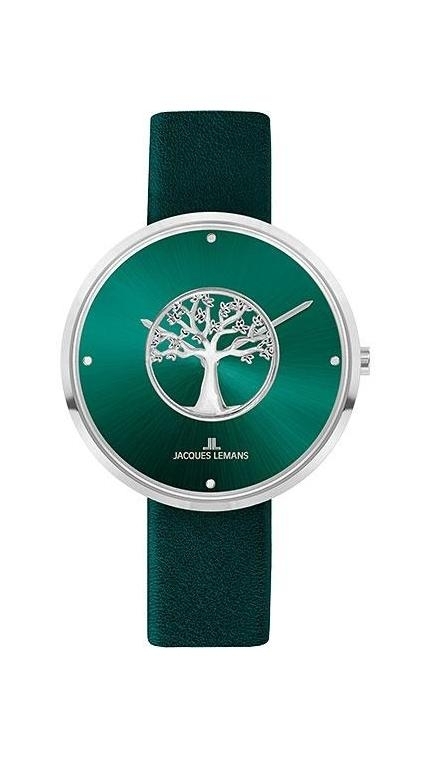 Насыщенный зеленый цвет циферблата служит фоном для главного элемента в форме дерева. Символ стабильности и силы выполнен из нержавеющей стали и помещен между двумя ударопрочными стёклами Crystex. Куполообразная форма внешнего стекла придаёт циферблату невероятный эффект объёма. Второе стекло защищает стрелки часов, часовую и минутную. Модель установлена в 36-миллиметровый корпус из гипоаллергенной нержавеющей стали. Зеленый ремешок выполнен из натуральной кожи, застёжка-пряжка украшена логотипом бренда.