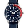 | запас хода держится до 180 дней. Инновационная технология этой модели сочетает в себе функциональность автоматических часов с точностью кварцевых. Гибридный механизм установлен в корпус диаметром 43 мм из нержавеющей стали с эффектным широким безелем. На синем циферблате хорошо читаются крупные стрелки и риски. Они выделены люминесцентным покрытием, которое светится в темноте, помогая определить время в любых условиях видимости. Окошко даты расположено в позиции «3 часа». В модели установлено ударопрочное минеральное стекло Crystex. Прозрачная задняя крышка позволит в подробностях разглядеть необычный механизм. Повышенная водостойкость 10 атмосфер. Ремешок сделан из натуральной кожи синего цвета. |