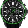 Кварцевый механизм хронографа установлен в крупный 48-миллиметровый корпус из нержавеющей стали c PVD-покрытием черного цвета. Безель с декоративными прорезями крепится к корпусу шестью винтами. Хорошо читаемые накладные риски, разнообразные по форме стрелки, накладные пластины и четкая индикация на дополнительных циферблатах и яркие цветовые акценты — все это вы увидите на черном циферблате модели. В часах предусмотрены функция 24-часового формата времяисчисления, минутный и секундный накопители и окошко даты. Стрелки и риски покрыты специальным люминесцентным составом, который светится в темноте. Заводная головка завинчивается, как и задняя крышка, обеспечивая повышенную водостойкость 20 атмосфер. В модели установлено ударопрочное минеральное стекло. Ремешок сделан из силикона, современного материала, который не боится повышенной влажности и отличается износостойкостью.